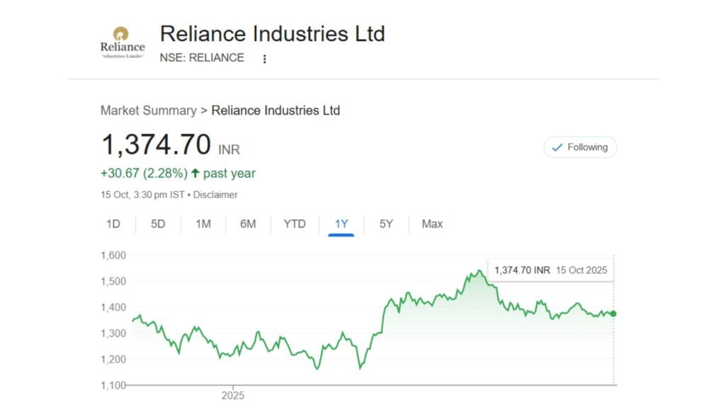 (Reliance Industries’ one-year stock chart showing a 2.28% rise to ₹1,374.70 as of Oct 15, 2025.)
