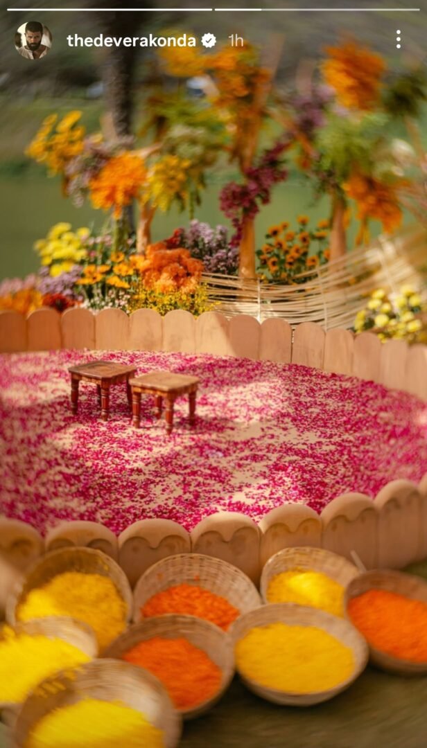 One of the biggest highlights from the haldi ceremony was Vijay Deverakonda’s sweet nickname for Rashmika Mandanna. The actor unveiled that he endears her with the name of Rushie and the name immediately became popular among the fans. One of the elements of their decor was their names Vijay and Rushie printed on flowered paper, with arrangements of real flowers.