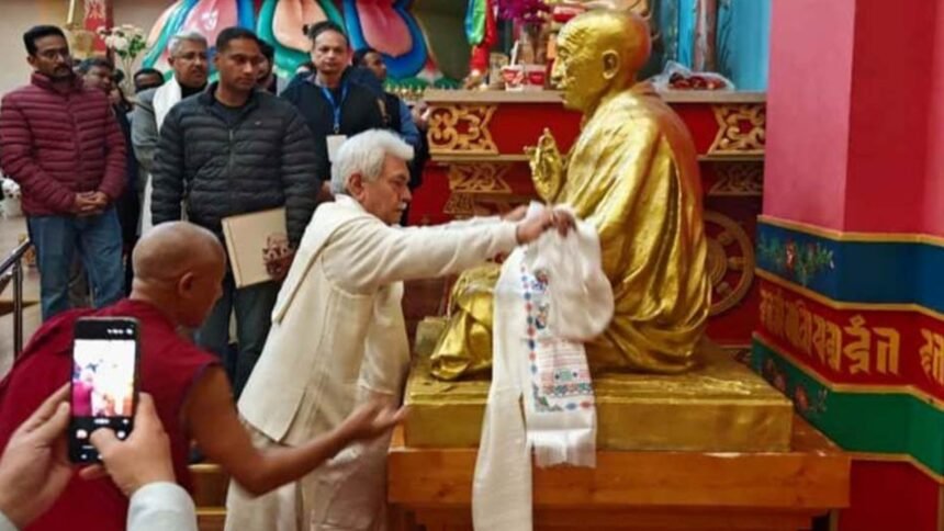 During his visit, Lt Governor Sinha offered “khatak” (ceremonial scarf) to the sacred relics, lit a lamp at the temple, and prayed before Bakula Rinpoche. He also presented a Kashmiri shawl to Shajjin Lama and received blessings.
