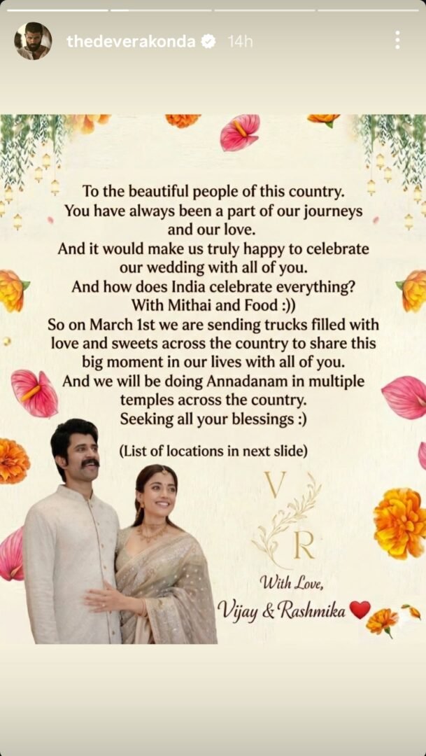 By choosing to celebrate their wedding through service and generosity, Rashmika and Vijay have set a powerful example for public figures. Their considerate move not only became the start of their new life together but also it has made everyone remember that the real celebration is in the sharing of happiness. The marriage of #ViRosh became one that was never forgotten by fans around the country because March 1 was a day of sweetness, blessings and love.