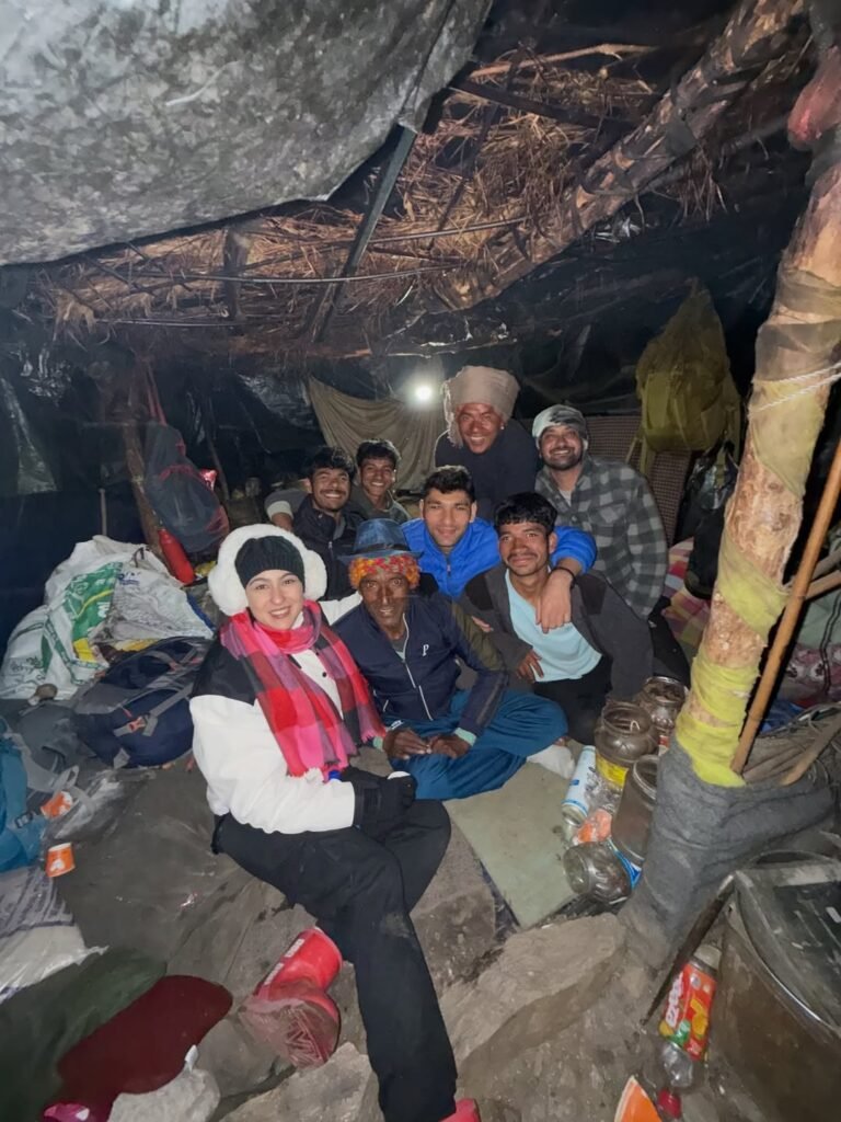 Connecting with Locals: One picture shows her sitting inside a basic tent with a group of local guides and other people, sharing a moment of rest.