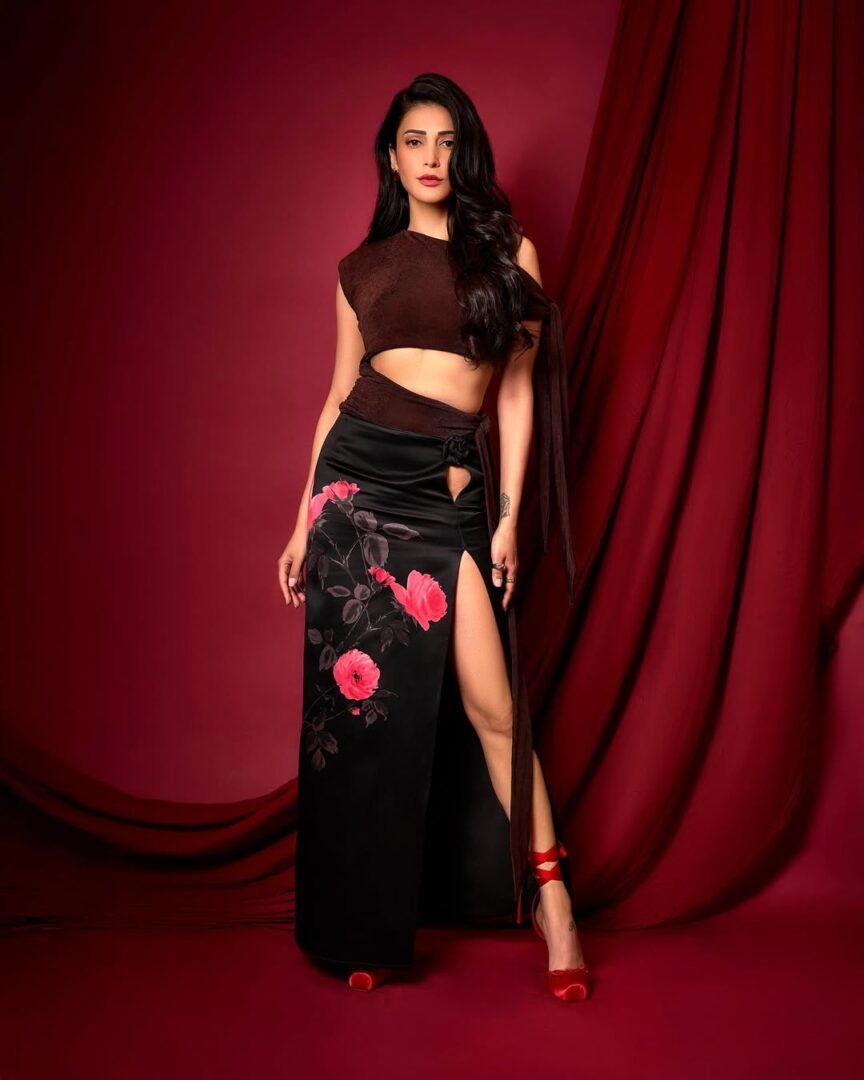 In the occasion Shruti opted out to wear a deep brown cut out crop top and a black thigh high slit skirt with red floral designs. The outfit was a perfect match of her fashionable sense of being edgy, but elegant. The silhouette and the bold cuts were also very special and a little bit more modern, without abandoning her experimental style that people have grown to adore.