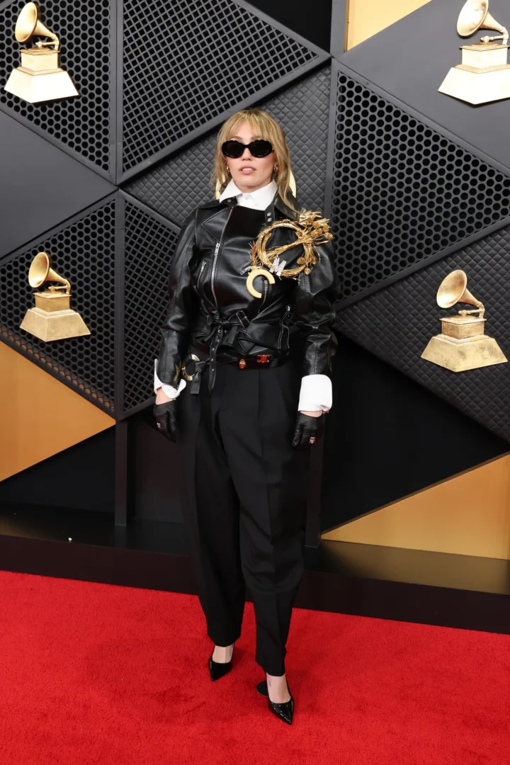 Miley Cyrus took a sharp turn away from traditional gowns and delivered one of the boldest looks of the evening. She opted for a tailored black outfit built around a structured leather jacket worn over a crisp white shirt. The appearance was a balance between masculine tailoring and punk attitude, and in combination with leather gloves, excessive sun glasses and a sculptural gold brooch, the appearance was dramatic. The look resembled rebellious, cool, and distinctly Miley, with her sparse makeup ensuring it was the confident energy of the outfit that was in the spotlight.