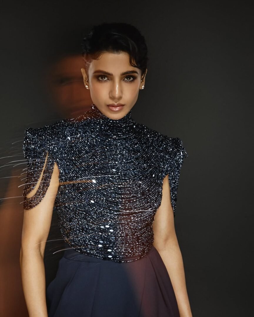 Makeup artist Avni Rambhia gave Samantha a luminous glow with soft smoky eyes, sculpted skin and glossy nude lips. She wore a sleek low bun with soft face-framing strands, her hair done by Dakshh Nidhi, to keep the attention in the neckline and the back detail. The appearance was completed with small diamond stud earrings and no additional accessories permitting the outfit to speak itself. Distorted Memories managed to capture the entire look beautifully.