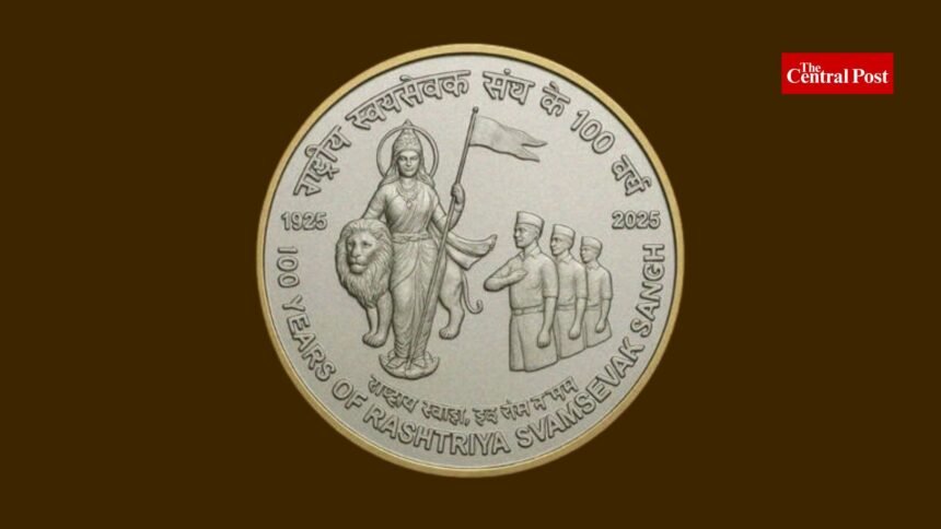 - Reverse: The reverse side is what makes the coin historic. It is dominated by a majestic depiction of ‘Bharat Mata’ seated on a lion in the ‘Varad Mudra’ (a gesture of granting blessings). In front of her, RSS swayamsevaks (volunteers) in their traditional attire are shown bowing in reverence.
