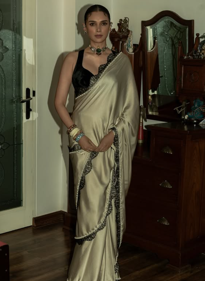 Aditi Rao Hydari’s look for the night was nothing short of breathtaking. She wore a pale gold satin saree with a soft champagne glow. The saree had black lace on the border along with delicate pearl details that created a magical mix of softness and strength. It matched the Graceful Warrior theme perfectly.