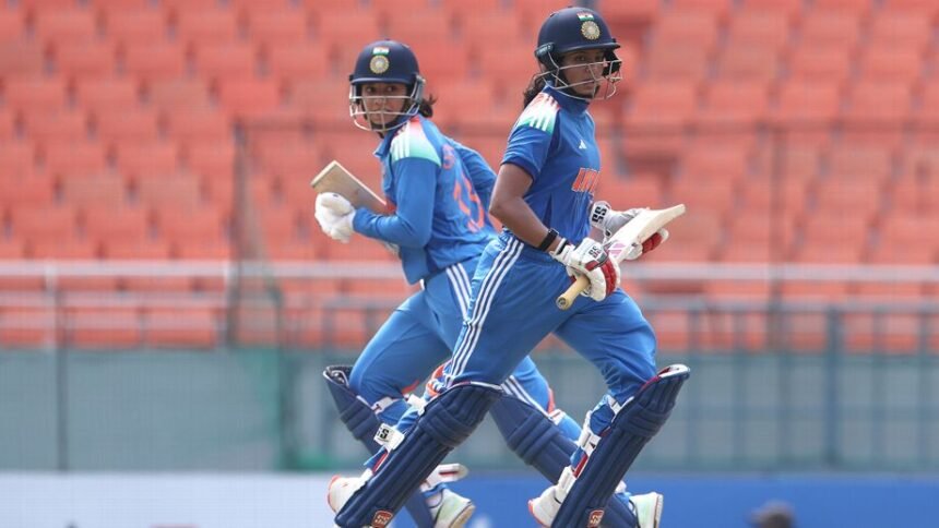Mullanpur: India’s top order fired in sync to put up a strong 281/7 in the series-opening ODI against Australia, with half-centuries from Smriti Mandhana (58), Pratika Rawal (64) and Harleen Deol (54) at the Maharaja Yadavindra Singh International Cricket Stadium—hosting its first-ever international match. India won the toss and batted first.