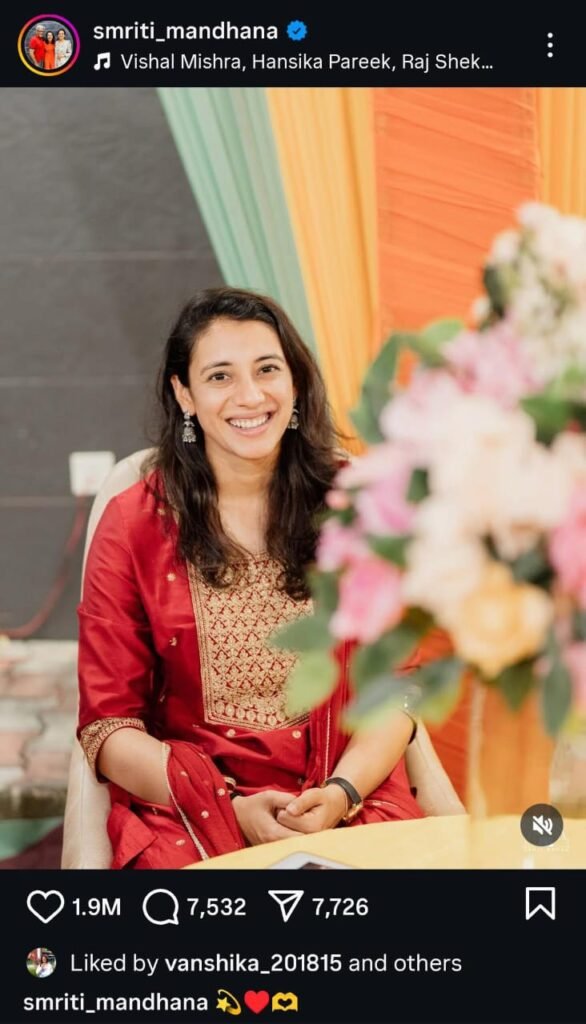In 2024, Smriti Mandhana and Palash Muchhal made their relationship official through an Instagram post. Palash is a singer, composer, and writer, and also the brother of well-known singer Palak Muchhal. Their post was simple and full of warmth, just like the two of them.
