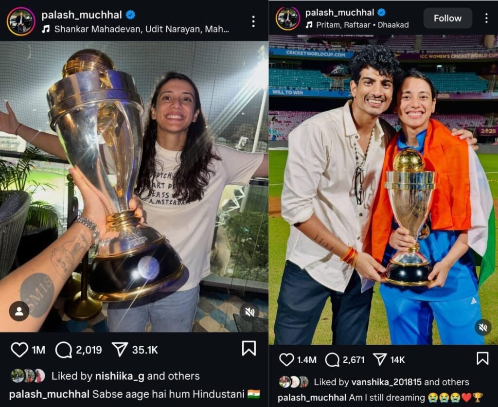 After India’s World Cup win, Palash shared a photo of Smriti holding the trophy with the caption, “Sabse aage hai hum Hindustani.” Later, he posted another picture of them together with the words, “Am I still dreaming?” Fans filled the comments with love and congratulations.