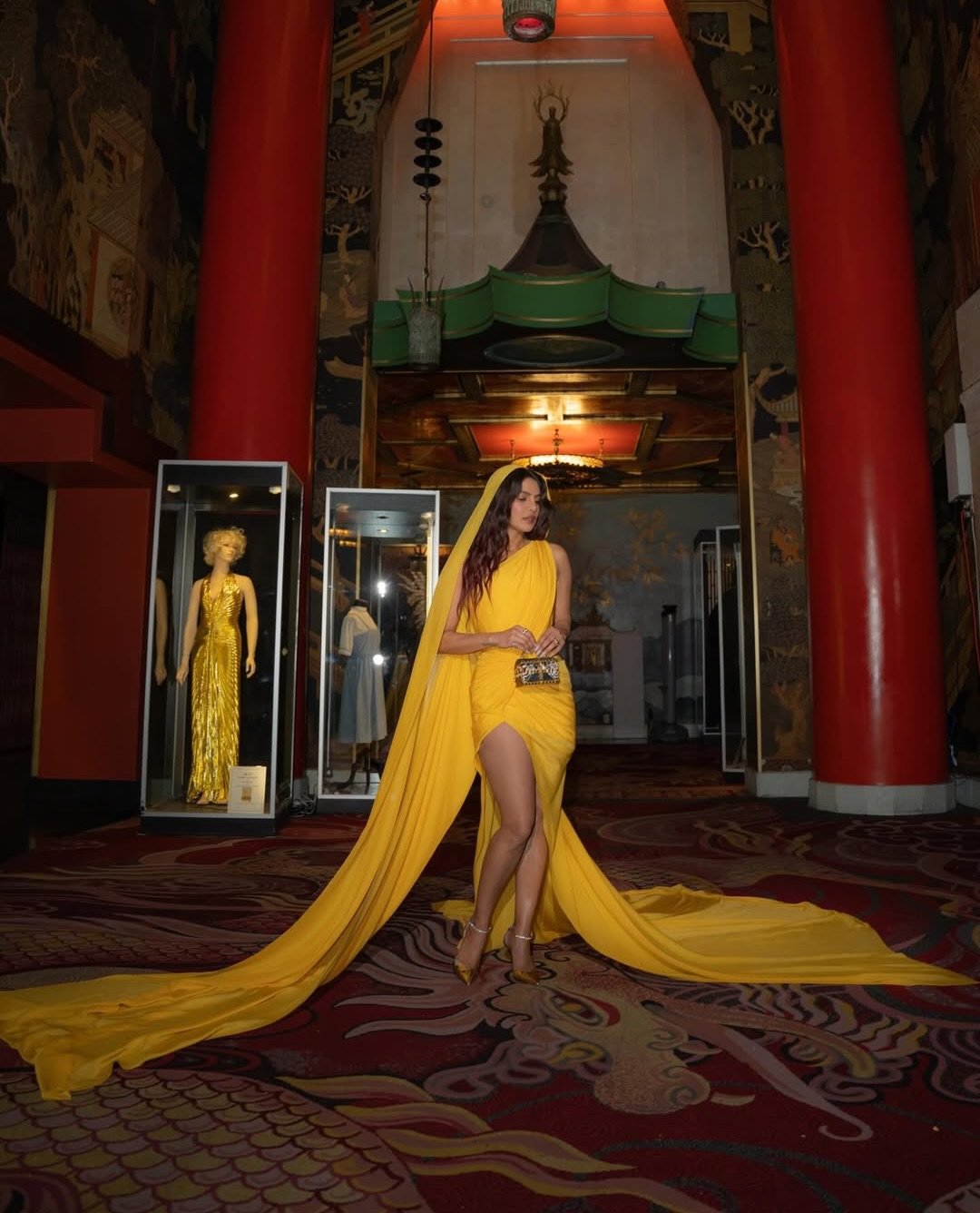 Priyanka wears the Golden Arc outfit from Gaurav Gupta’s Spring Summer 2026 couture collection. The design blends a saree and gown silhouette, making it perfect for the red carpet. The light chiffon fabric gives soft and flowy movement, while the bright saffron-yellow colour adds instant drama and warmth. The corset-style bodice shapes the waist and creates a sculpted look.