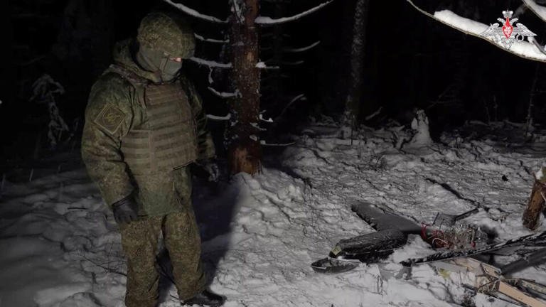 The video, shot at night in the dark, showed a damaged drone lying in snow in a forested area. The ministry said the alleged attack was “targeted, carefully planned and carried out in stages.”