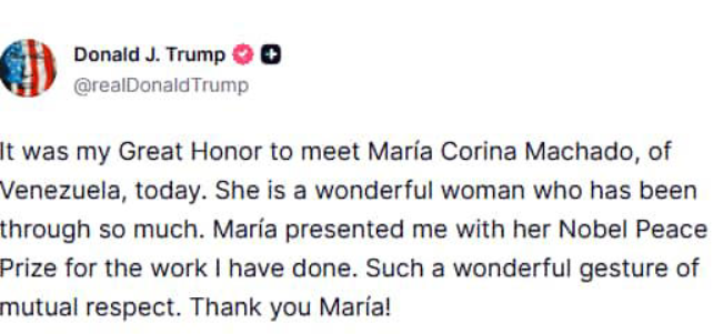Venezuelan opposition leader Maria Corina Machado said she presented her Nobel Peace Prize to US President Trump, who described it as a “wonderful gesture of mutual respect,” during the Thursday meeting at the White House. Machado, who has on previous occasions said that she would give her Nobel prize to Trump. A White House official confirmed to news agency Reuters that he intends to keep the medal.