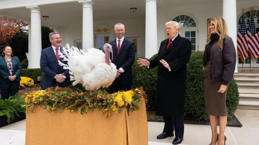 Trump also revisited last year’s ceremony, claiming that the 2024 presidential pardon for turkeys Peach and Blossom was “invalid” because it had been signed using an autopen. He announced that he was “re-pardoning” them.